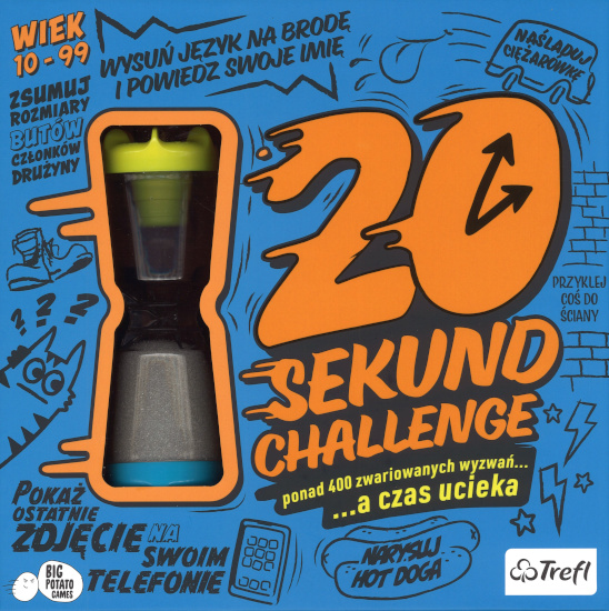 Zawartość pudełka: 222 dwustronne karty z wyzwaniami, 2 karty „NA POMOC!, klepsydra, instrukcja.