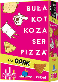 GRA KARCIANA. Każdy z graczy otrzymuje talię złożoną z identycznej liczby kart, których nie wolno im podglądać! Pierwsza osoba wykłada odkrytą kartę na środek, mówiąc Buła. Gracz po jej lewej kładzie swoją odkrytą kartę na poprzednią, mówiąc Pizza. Wymienianie w kółko kolejnych słów z tytułu trwa dopóki karta, która właśnie została wyłożona, nie będzie pasowała do wypowiadanego przez gracza słowa (np. wyłoży Pizzę, mówiąc Pizza). W tym momencie wszyscy muszą jak najszybciej położyć swoje dłonie na środkowym stosie kart, a ostatni gracz, który to zrobi, bierze cały stos do siebie i dodaje do już posiadanych kart. Celem jest pozbycie się wszystkich swoich kart. Buła, Kot, Koza, Ser, Pizza - Na opak wywraca do góry nogami nie tylko wyliczankę, ale i same karty. Ich odwrócone wersje będą wymagały zupełnie innego reagowania.