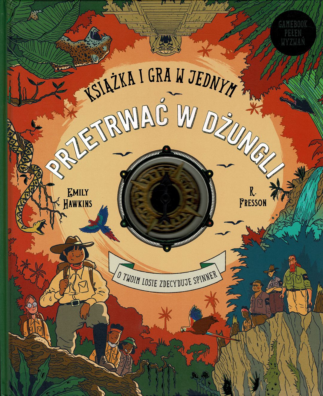 "Pomysłowa i innowacyjna książka i gra w jednym. Gamebook, w którym czytelnik tworzy fabułę w trakcie lektury, dokonując wyborów przy użyciu spinnera. Bohater książki „Przetrwać w dżungli” rusza na ratunek zaginionemu miastu w puszczy amazońskiej. Musi się spieszyć, aby dotrzeć do pradawnej świątyni boga Jaguara i ochronić ją przed łowcami skarbów. Jednak nic nie idzie tak, jak powinno. Wypada bowiem z pontonu do spienionej rzeki w dżungli i musi poradzić sobie w ekstremalnych warunkach. W podejmowaniu kluczowych decyzji pomaga mu, dołączony do książki, specjalny spinner przetrwania. Wystarczy umieści go w wyznaczonych miejscu, zakręcić i kierować się wskazówkami, aby kontynuować wyprawę. Ale jeden zły krok… i zabawa zaczyna się od początku! Książka ma wiele wersji fabuły i kilka zakończeń. Dzięki temu zabawa (i lektura) trwa znacznie dłużej i stwarza możliwość przeżycia niesamowitych przygód. Podobnie jak bestsellerowy gamebook „Przetrwać w górach”, także „Przetrwaćw dżungli” wciąga bez reszty, rozwija wyobraźnię, uczy logicznego myślenia i przekazuje sporo praktycznej wiedzy dotyczącej tajników sztuki przetrwania. Czytelnicy dowiedzą się m.in., jak zrobić tratwę, wydostać się z ruchomych piasków, odeprzeć ataki dzikich zwierząt, poradzić sobie z ukąszeniem jadowitego węża, gdzie szukać jedzenia w lesie i jak rozpalić ognisko sygnałowe".
