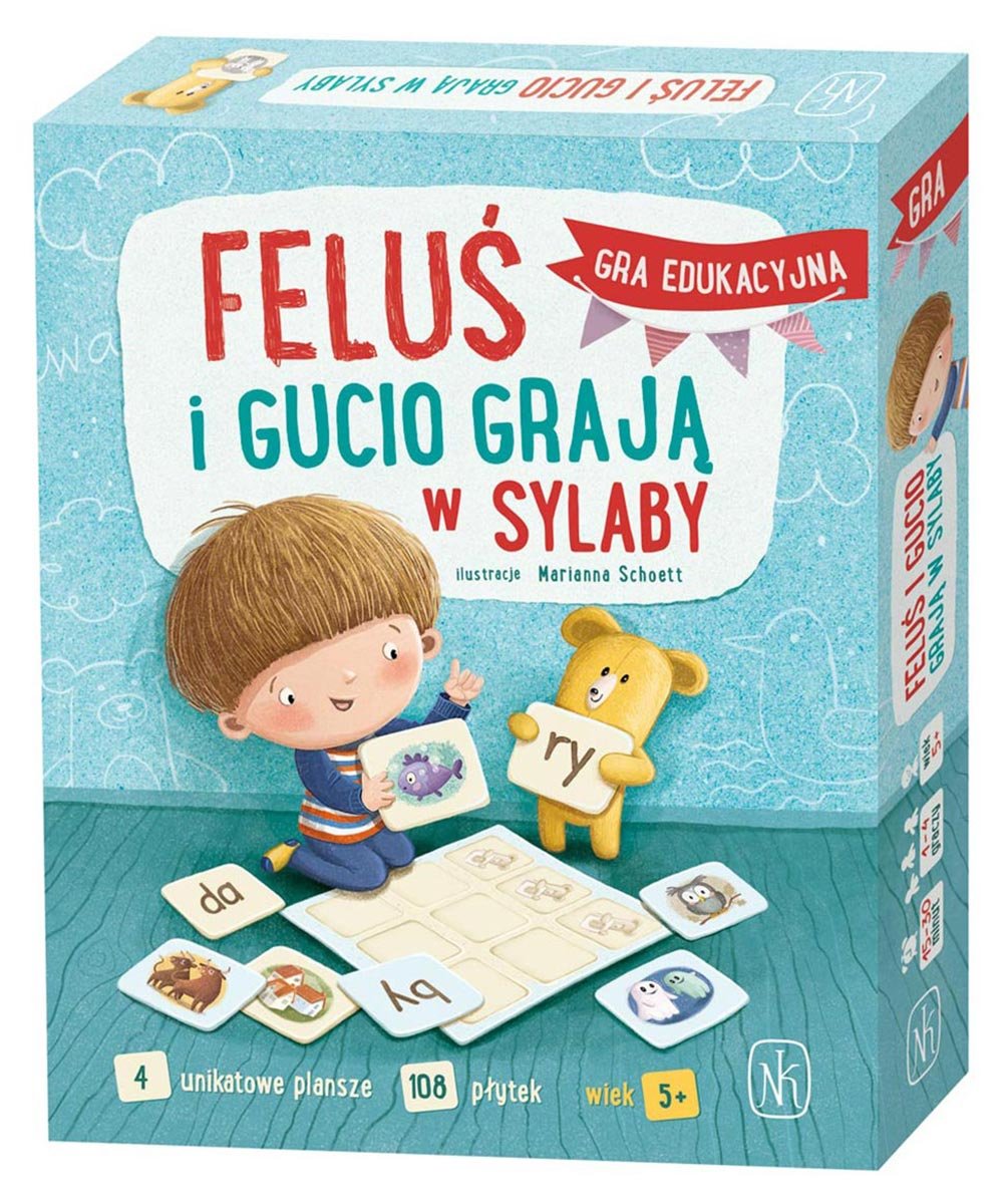 Feluś i Gucio zapraszają do wspólnej zabawy w układanie sylab! Ta przepięknie ilustrowana przez Mariannę Schoett gra, daje możliwość układania dwu- oraz trzysylabowych słów. Gra edukacyjna wspierająca naukę czytania - 7 zróżnicowanych wariantów gry.
