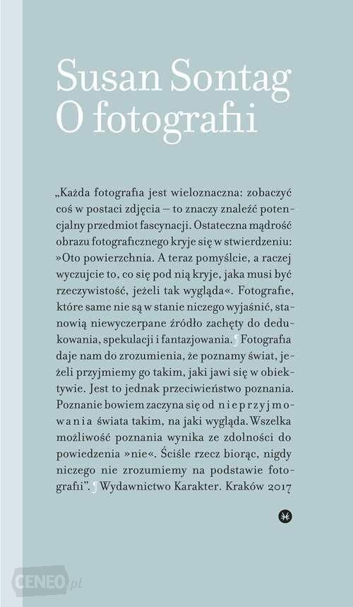 "Najważniejsza w historii książka poświęcona fotografii. Wybitna amerykańska intelektualistka bada znaczenie i funkcję fotografii we współczesnym świecie. Czym w swej istocie jest fotografia? Jakie są jej związki z malarstwem i sztuką? Jak zjawisko fotografii zmieniło nasz sposób postrzegania świata? W jakim stopniu fotografia interpretuje rzeczywistość? Jaka jest relacja między fotografem i obiektem oraz między zdjęciem a patrzącym? Na czym polega współczesny heroizm widzenia? Z jakich powodów sięgamy po aparat fotograficzny? Dlaczego skłonni jesteśmy przechowywać zdjęcia bliskich nam osób? Autorka analizuje prace wybitnych fotografów, przytacza teksty pisarzy i filozofów, ale pisze również o fotografowaniu jako części codziennego życia, swoistym społecznym rytuale,starając się zrozumieć jego funkcję i sens. Głośna książka Susan Sontag to nie tylko zbiór błyskotliwych esejów o fotografii, lecz też pasjonująca, wnikliwa analiza współczesnego świata. Bo przecież, jak sama pisze, „zbierać fotografie to zbierać świat..."